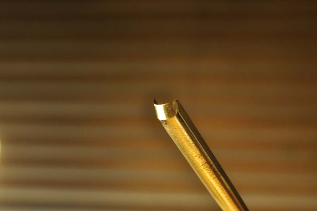 カンナは研ぐ時の角度を保つ補助具(自転車の補助輪と同じく安定させてくれる)があるので楽ですが、丸ノミはなかなか難しいです。丸ノミの刃の形にピッタリの溝の砥石があれば楽ですが、それではいくつあっても足りません。機械の導入も検討しましたが、まだ手研ぎで間に合う程度なので今の所は見送っています。「とにかく平面で綺麗に研げなければいけない」と思いながら試行錯誤を繰り返して、ようやく平面で丸ノミを研げるようになりました。