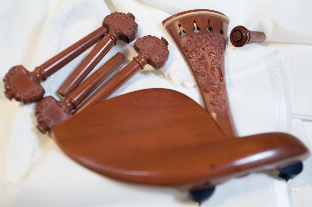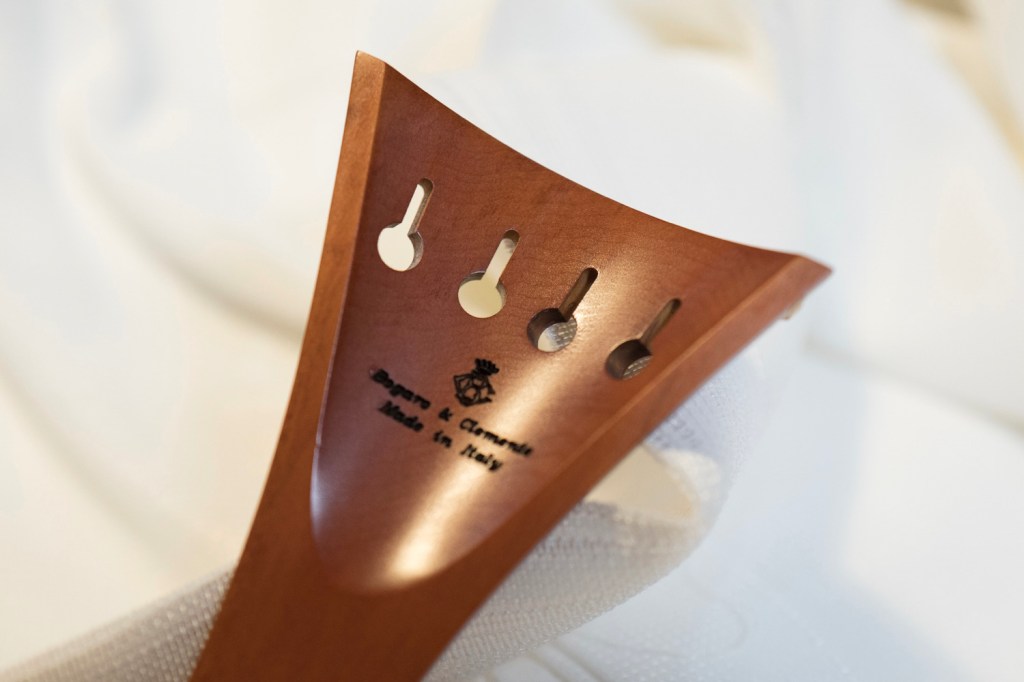 1年という時間が掛かったのはペグとテールピース、エンドピンが彫刻である事でした。アジアで作られている彫刻のフィッティングとは一線を画する仕上がりはボガーロ&クレメンテならでは。