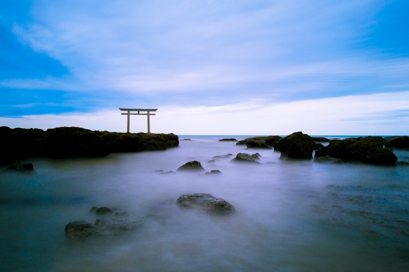 波が押し寄せる岩場に立つ鳥居を長秒露出で撮影しました。