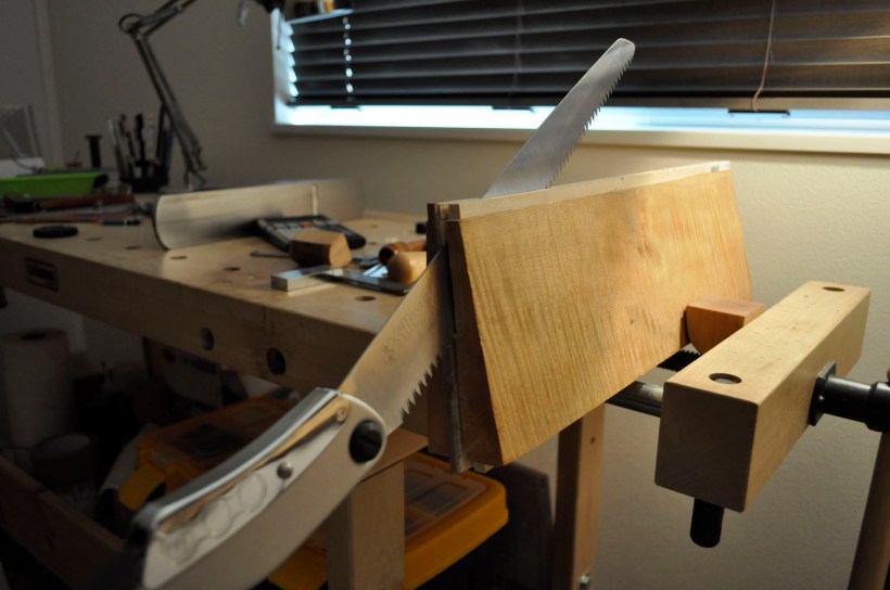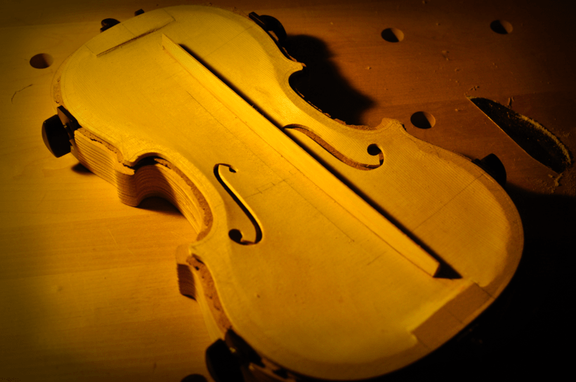 今回のストラディヴァリのモデル、タイタンのボディは残すところヴァイオリンの表板を閉じるというタイミングに来ております。ここで閉じても良いのですが、もう少し時間をかけて微調整を施したいと思っているのでネックとスクロールに作業を移しました。