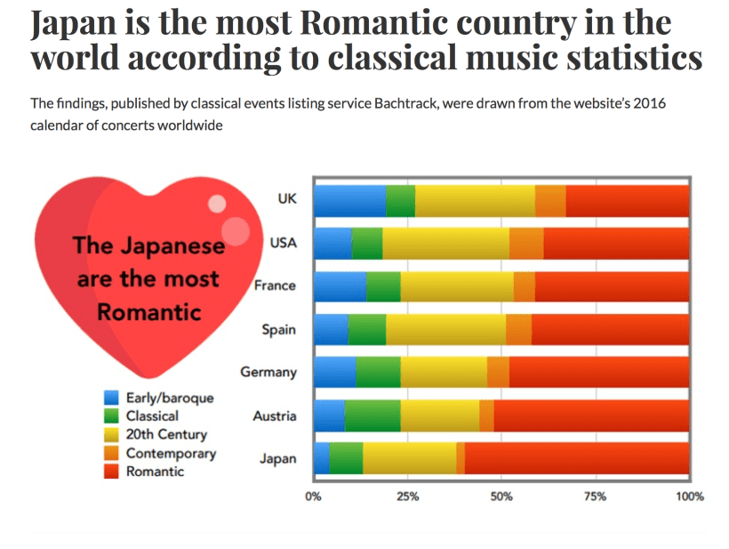 クラシックのイベント統計を取っている” Bachtrack”というウェブサイトで2016年の統計結果が発表されました。その結果によると2016年は日本が最もロマンティックだったという結論が導かれたそうです。