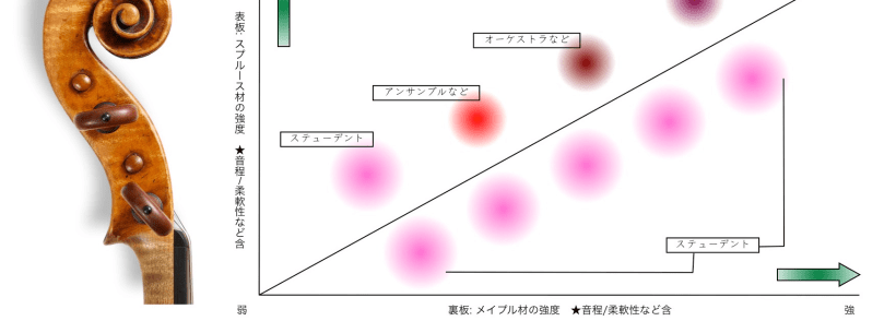 ヴァイオリンに用いられるスプルースとメイプルという木材はヴァイオリンにとって音響的に理想的な材木です。「木材の比重とヴァイオリンに用いられる”トーンウッド”」についてご説明を。ステューデント/アンサンブル/オーケスタラ/ソリストなどのカテゴライズにも関係します。