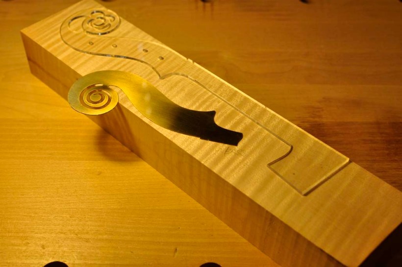ここまで側面方向からのアウトラインを切り出してペグ穴を開けたところでした。その後、正面と背面の前後方向からペグボックスとスクロール部分のアウトラインを切り出します。