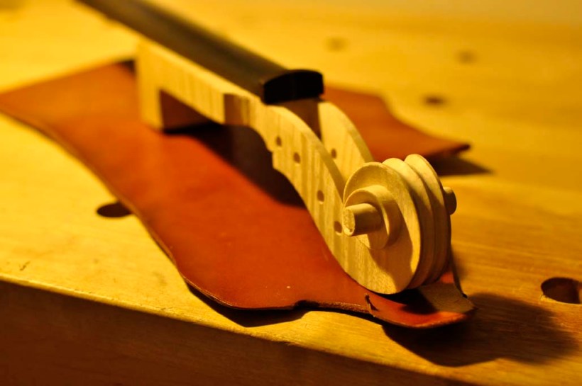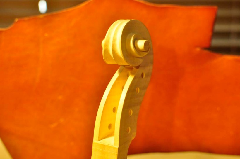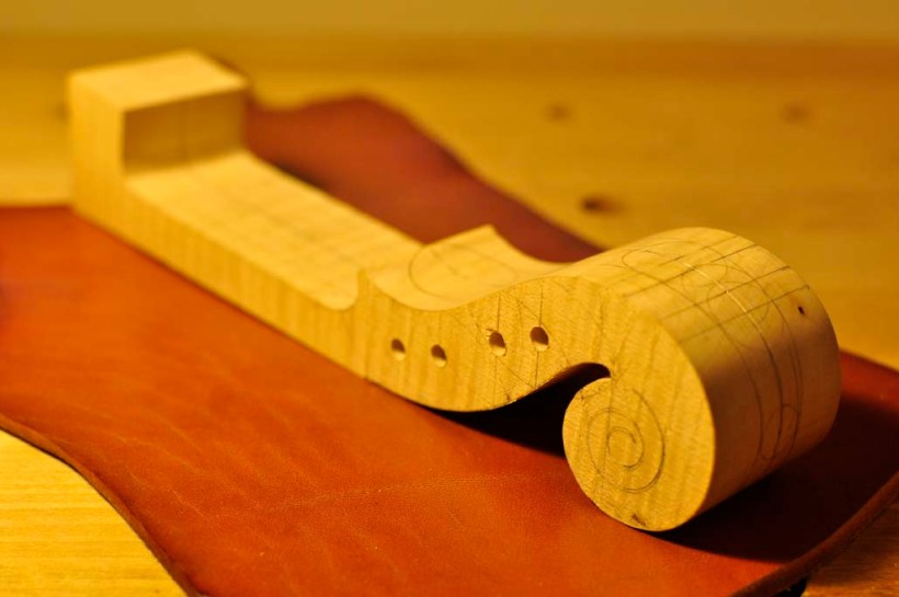 今回のストラディヴァリのモデル、タイタンのボディは残すところヴァイオリンの表板を閉じるというタイミングに来ております。ここで閉じても良いのですが、もう少し時間をかけて微調整を施したいと思っているのでネックとスクロールに作業を移しました。